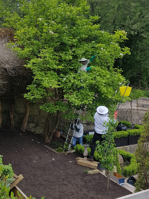 Back to the swarm. By this morning, they still hadn't moved from the tree, and it was looking like something needed to be done - Mark and his family really needed their garden back! So, this afternoon Amelia and I tooled up and headed round to Mark's house with a spare bee suit and a very vague idea of a plan.